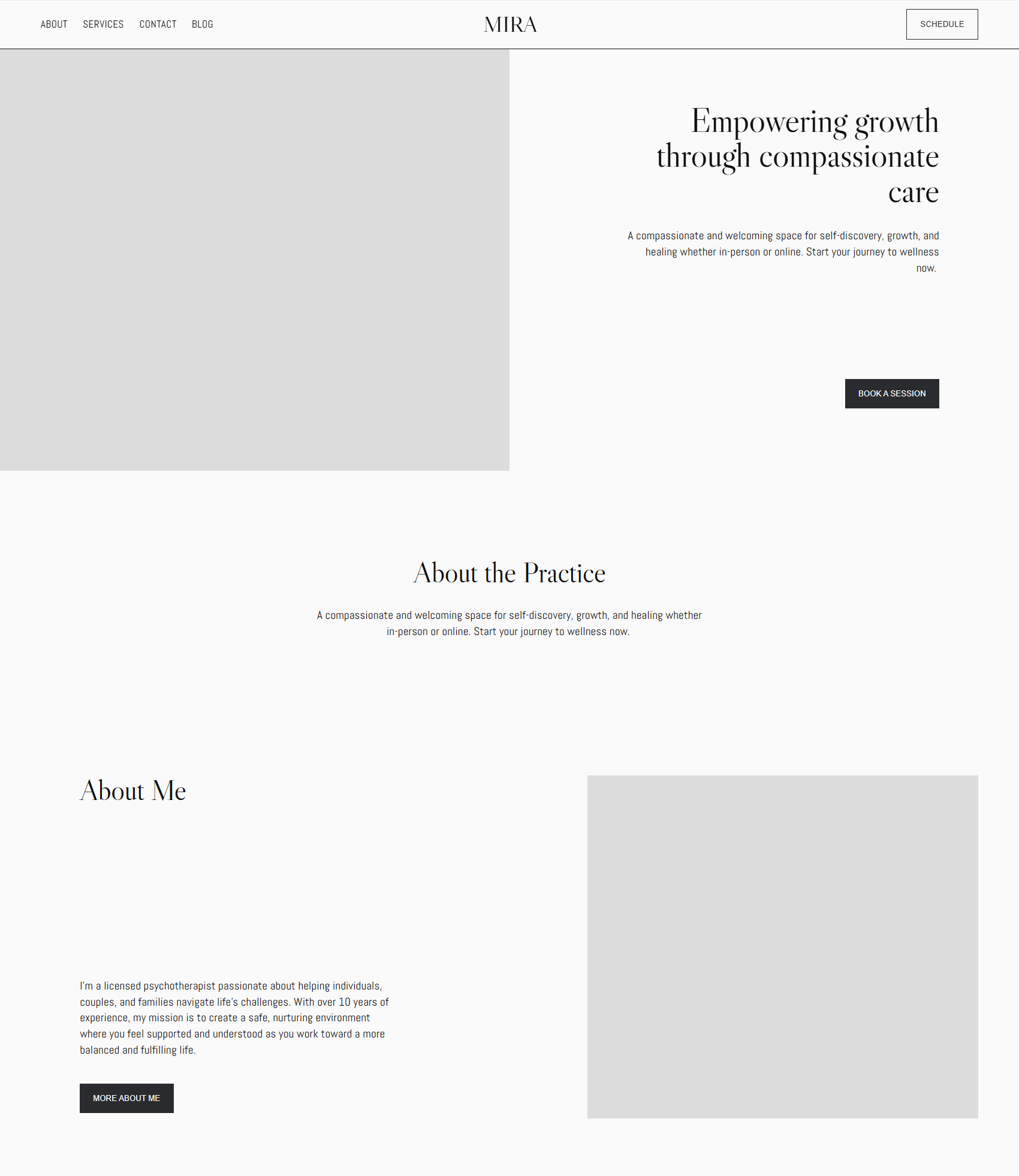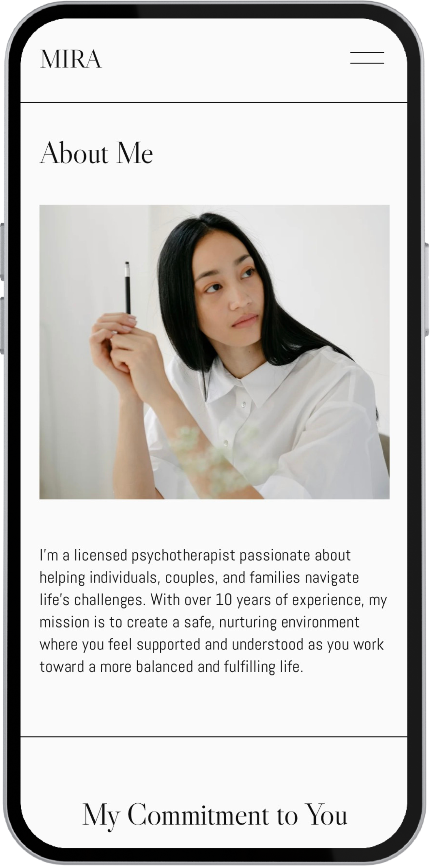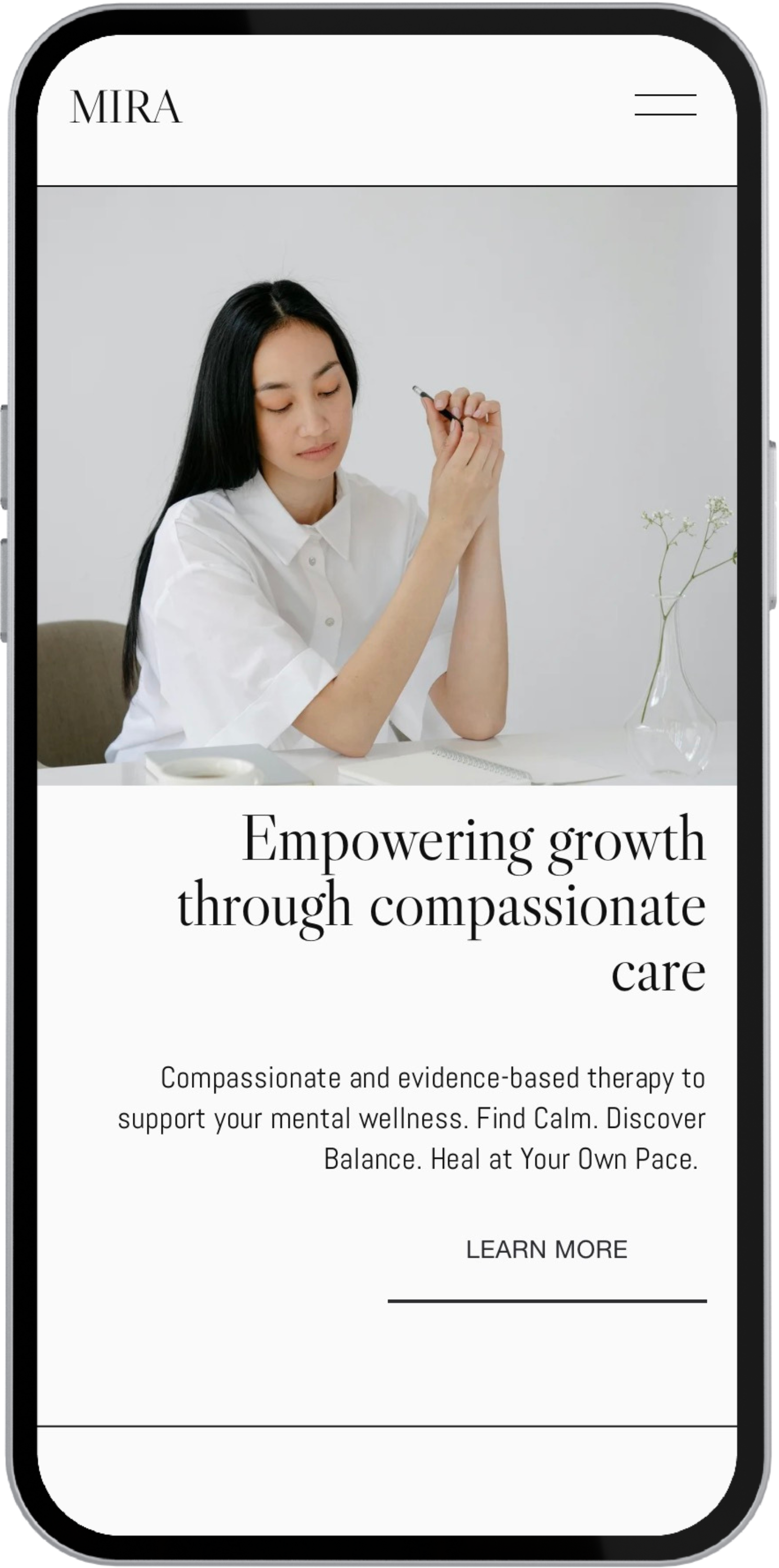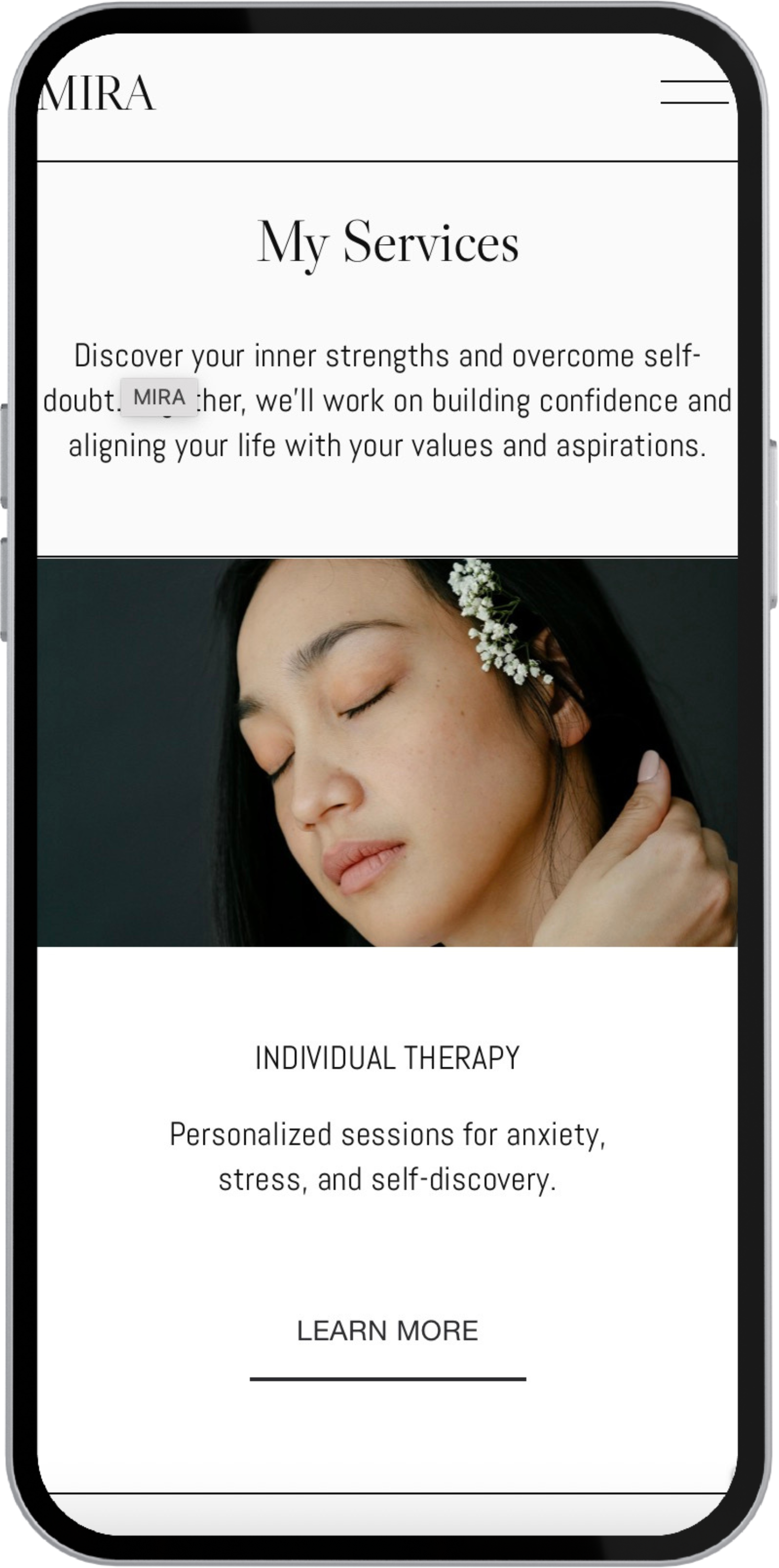 Project Overview: MIRA is a high-converting, psychology-informed website template designed specifically for therapists. The goal of this project was to create a trustworthy and easy-to-navigate digital experience that supports both emotional connection and business conversion.