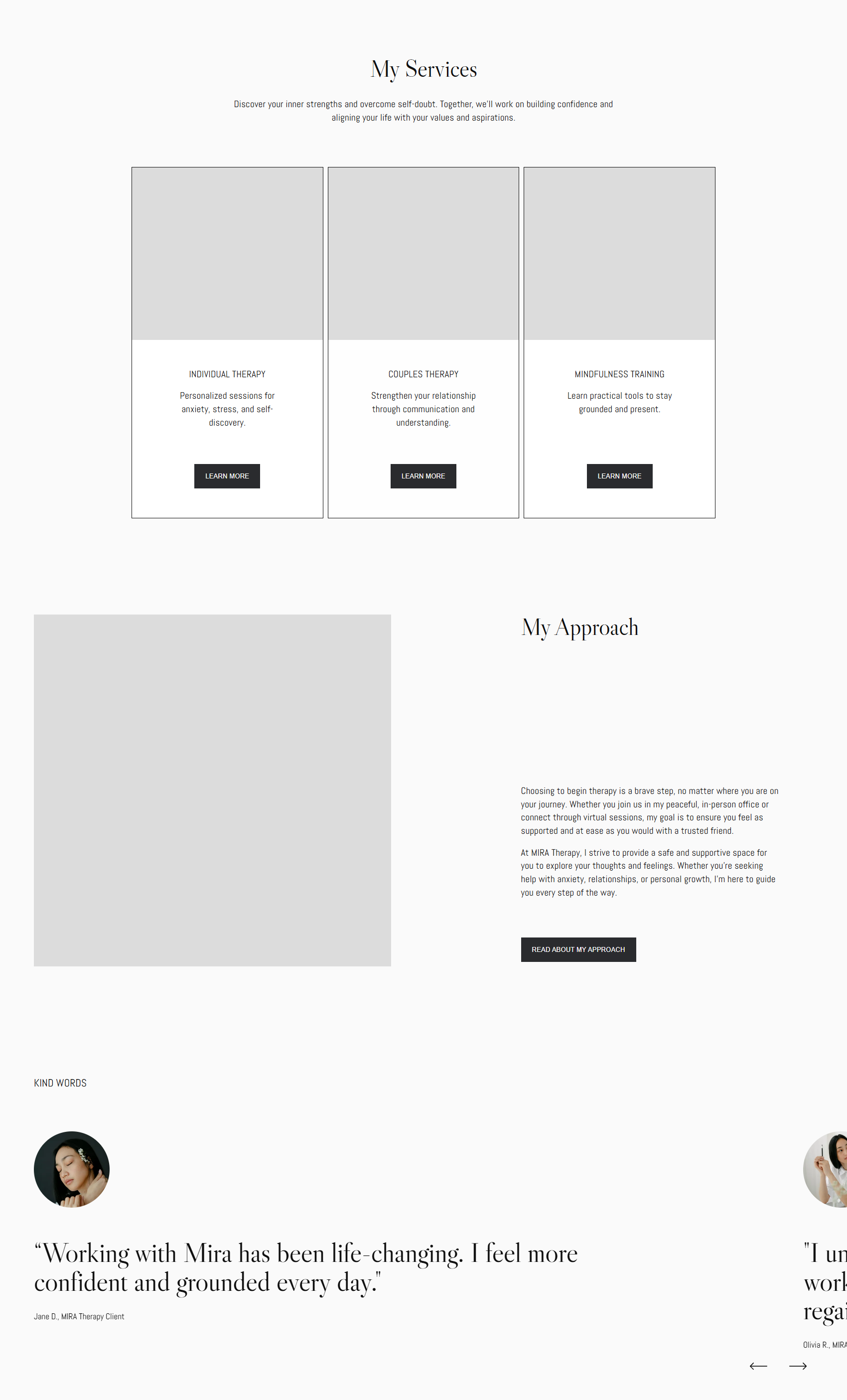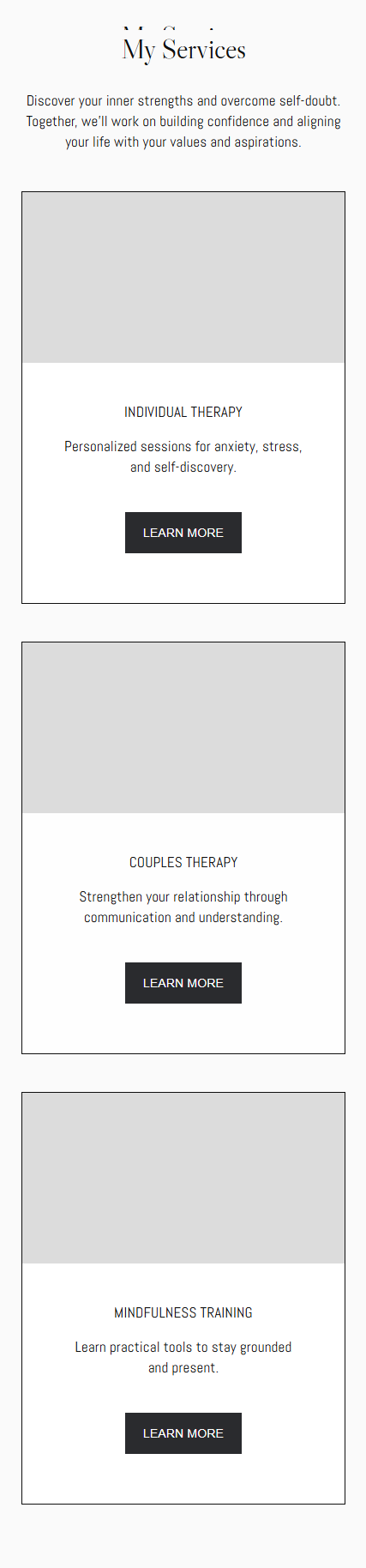 A well-structured Services section helps therapy clients quickly evaluate whether the practitioner’s approach matches their needs, reducing uncertainty and making the next step feel more accessible.