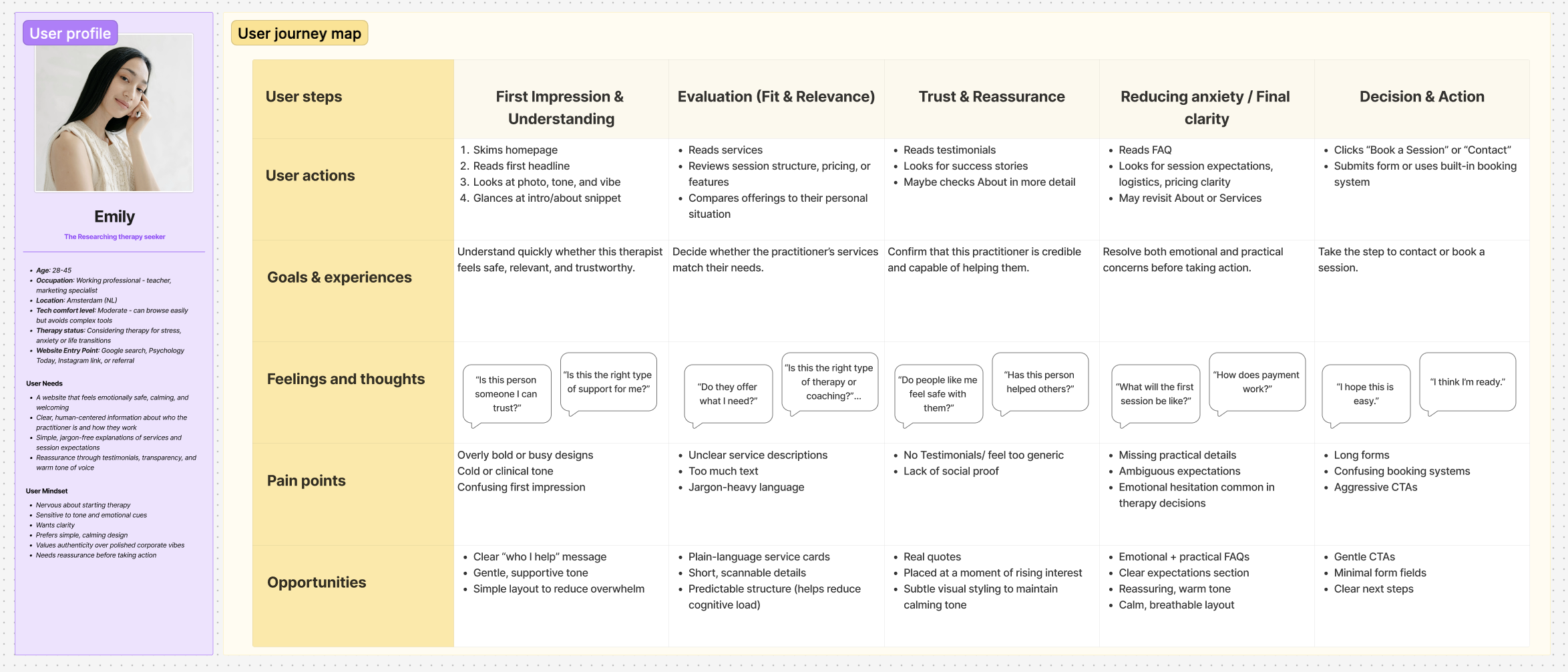 The user journey focuses on guiding potential therapy clients through a trust-building experience that supports both emotional reassurance and clear decision-making. I chose this approach because it allows me to align my design choices with the emotional needs of therapy clients.