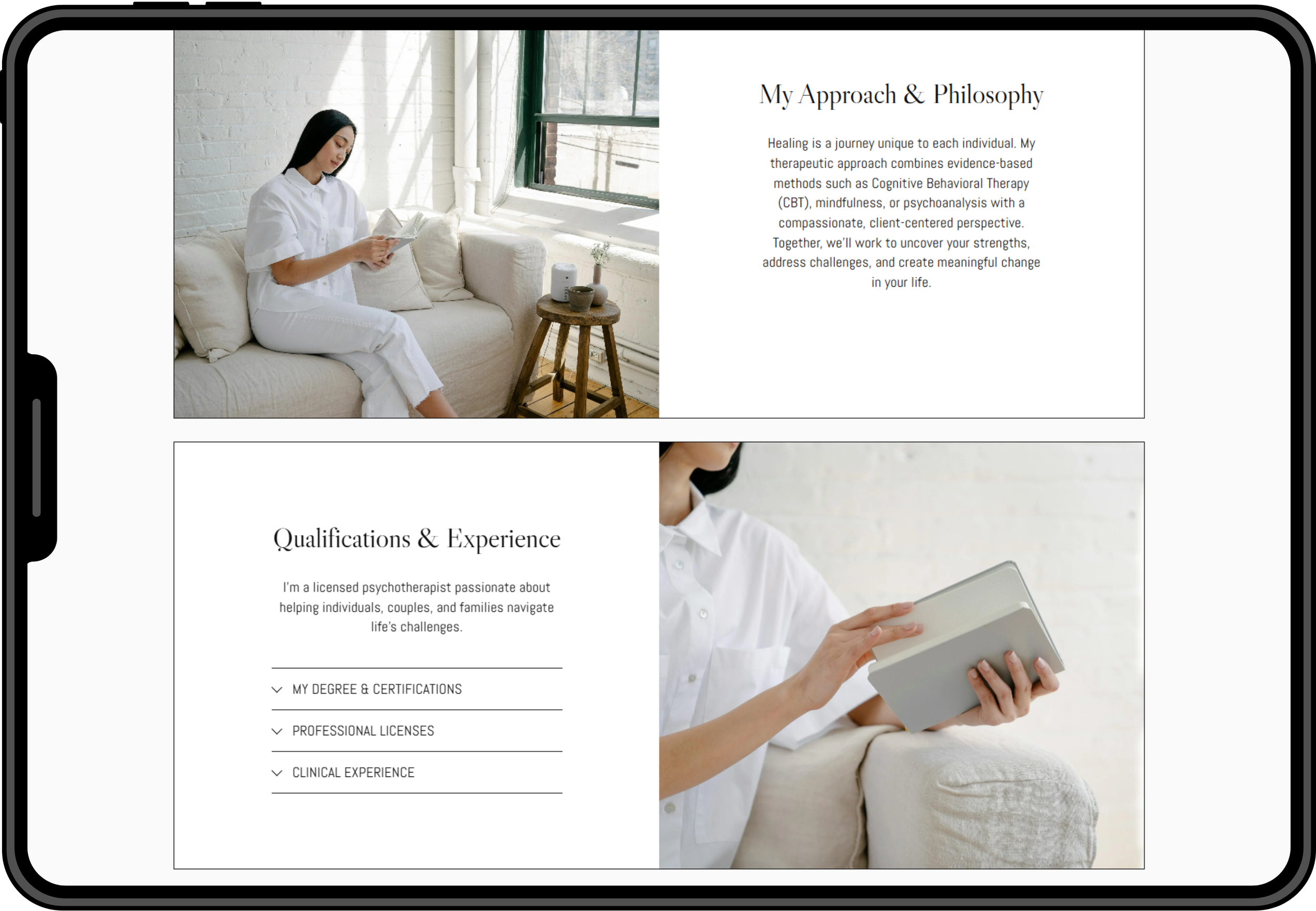 Speaking directly with therapists helped me see how their needs differ from typical small-business owners. They needed a template that balanced professionalism with warmth and many struggled with clearly communicating their services. These conversations grounded the entire project in real practitioner needs rather than surface-level design trends.
