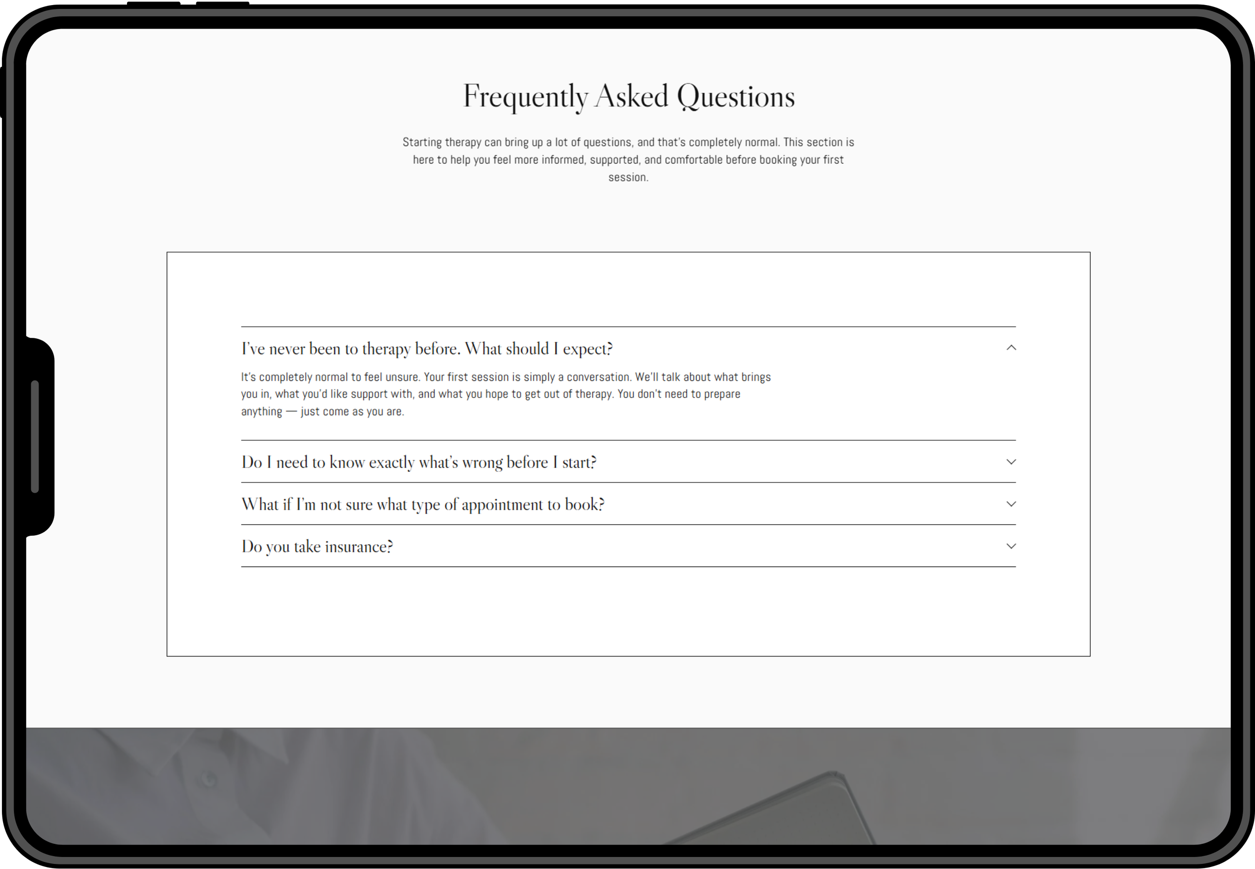 Linear, trust-building flow: Structured the site so users move naturally from safety → understanding → evaluation → reassurance → action, mirroring how therapy clients make decisions.