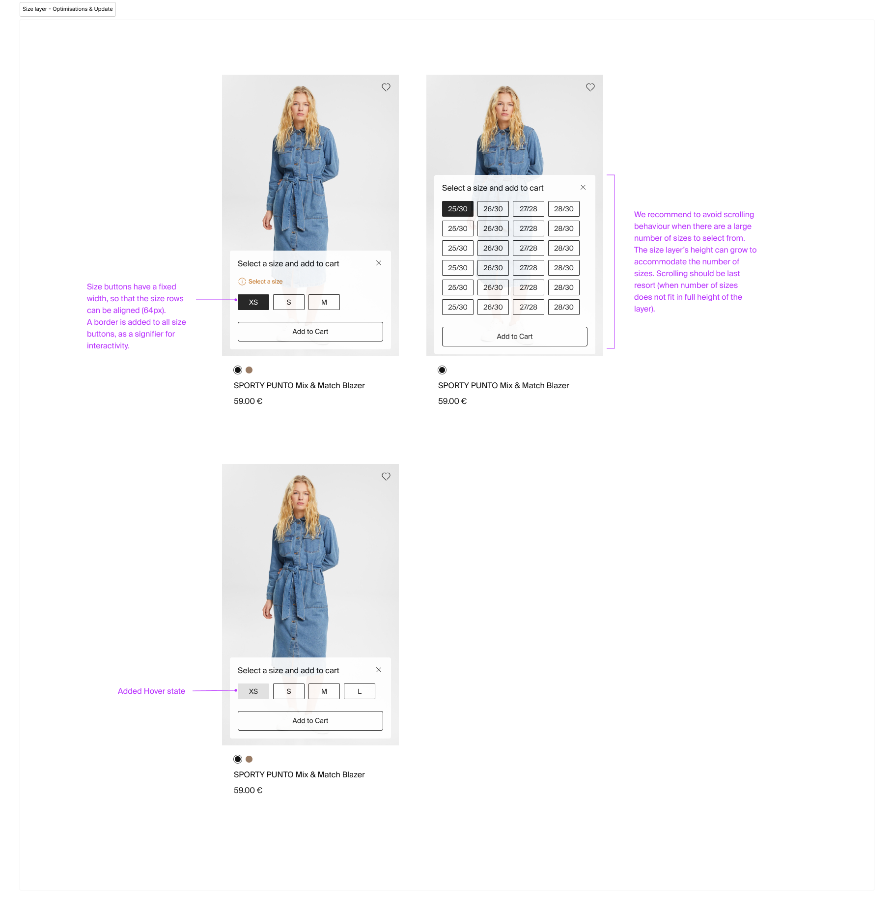 For the Small and Medium screen sizes, the size layer appears in a modal (or drawer) overlay (slide-up for mobile and side slide-in for tablet).